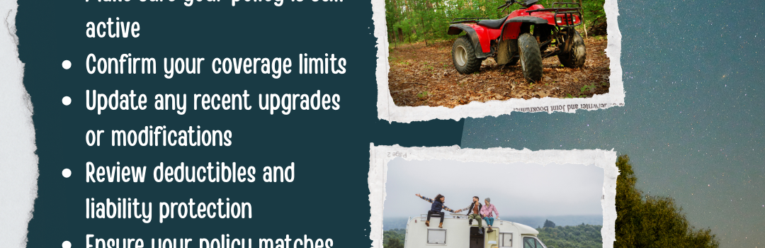 While most people focus on maintenance and cleaning, insurance coverage is often overlooked. Taking a few minutes to review your policy now can help prevent problems later and ensure you’re fully protected when you start using your recreational vehicles again.